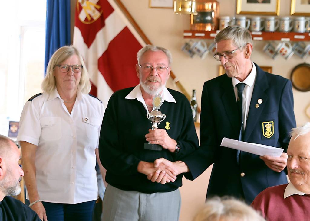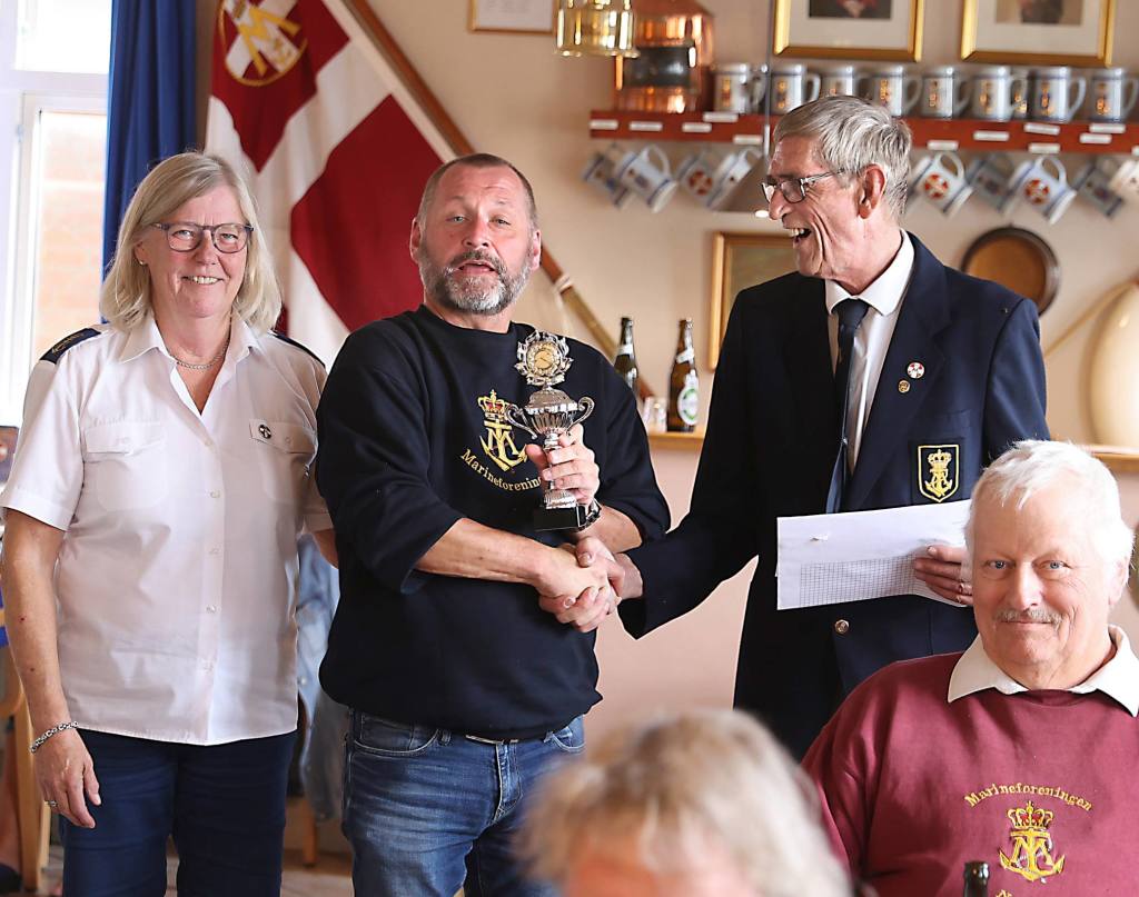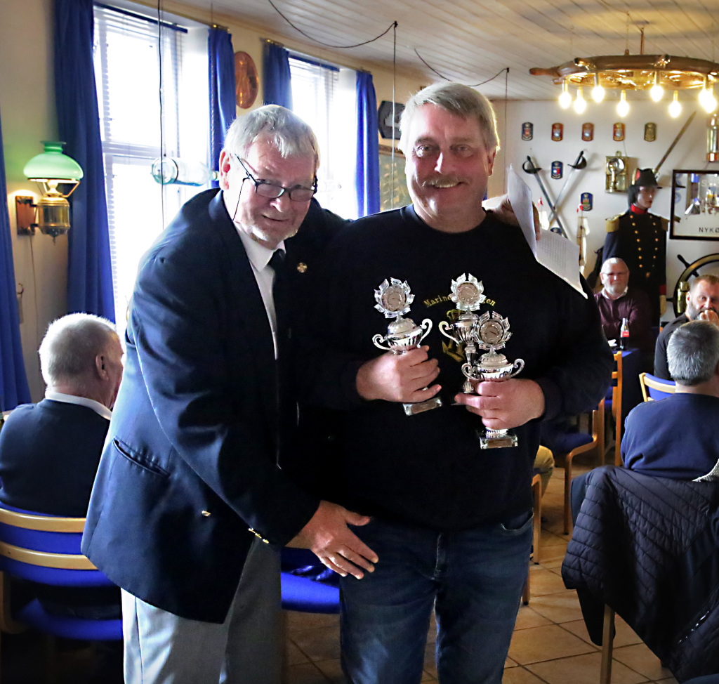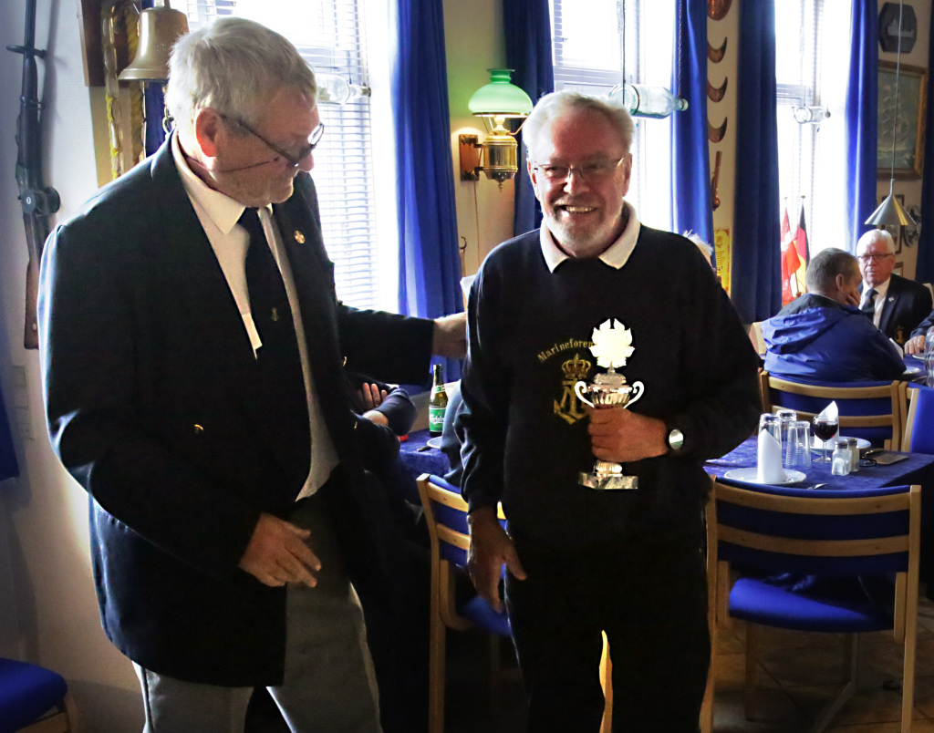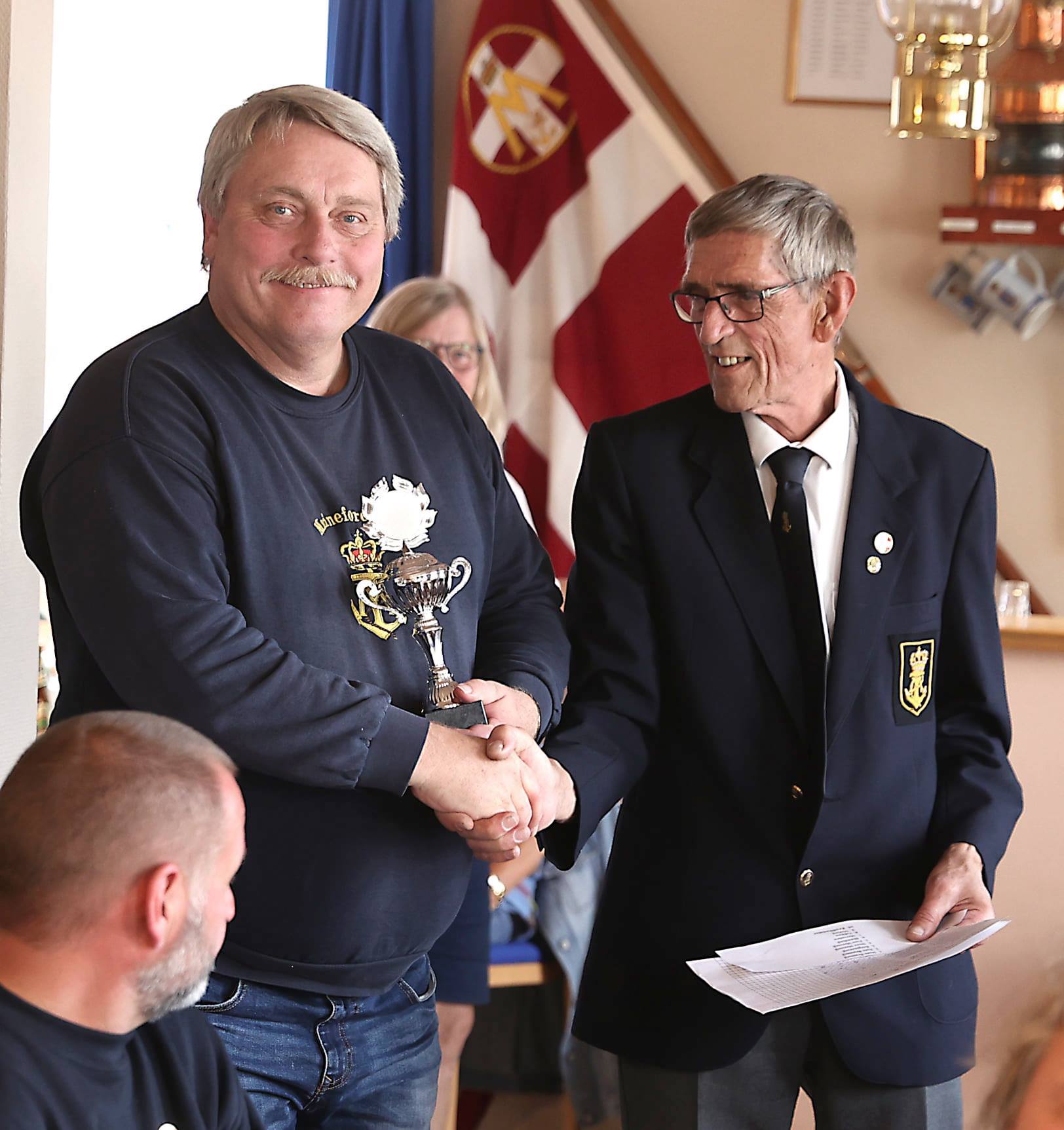 På billedet overrækker Nyk.F. Marineforenings formand Karsten Laugesen pokalen til Nakskovs Henning Larson