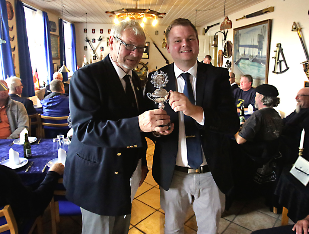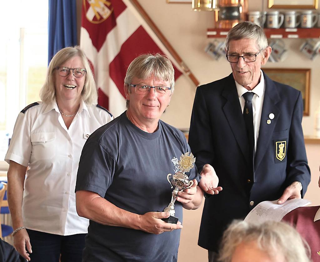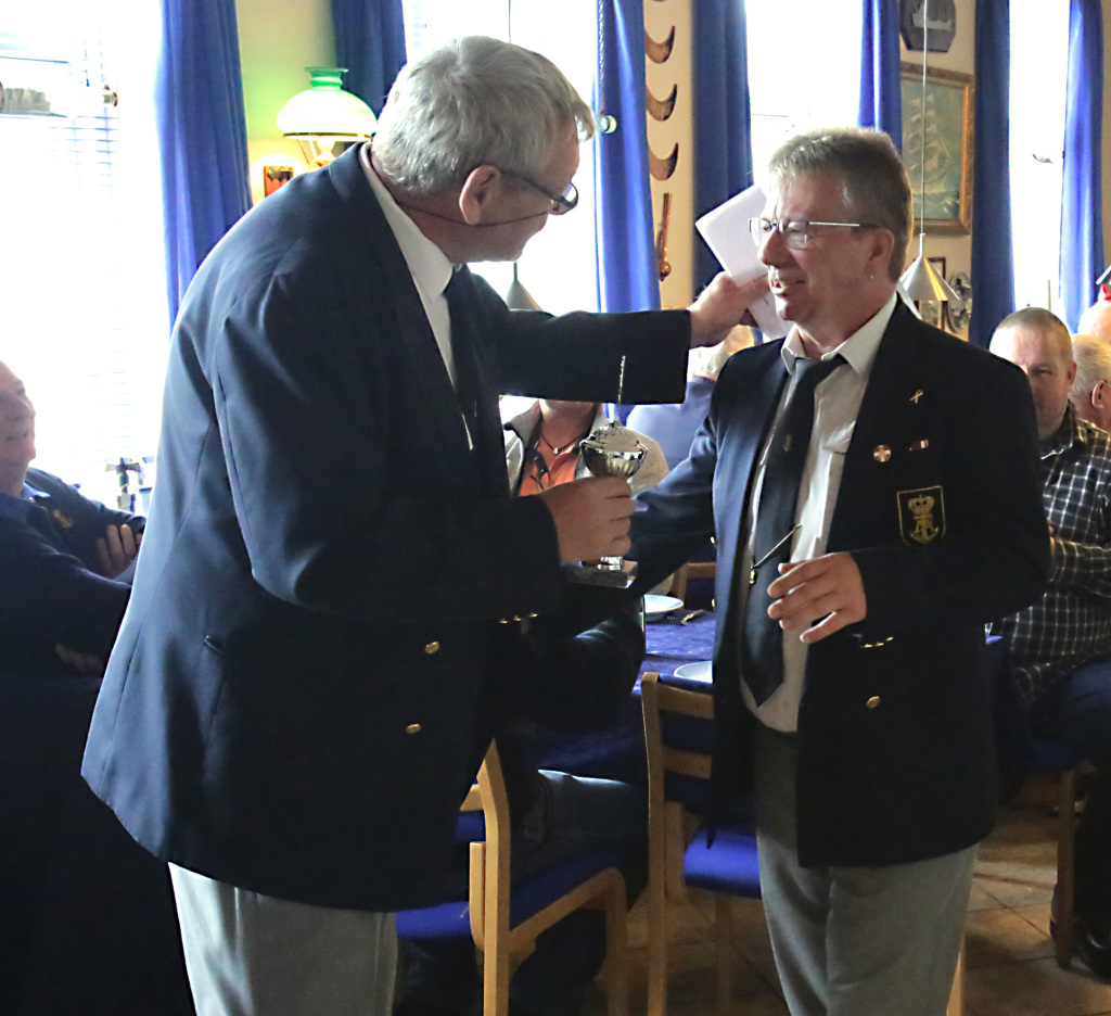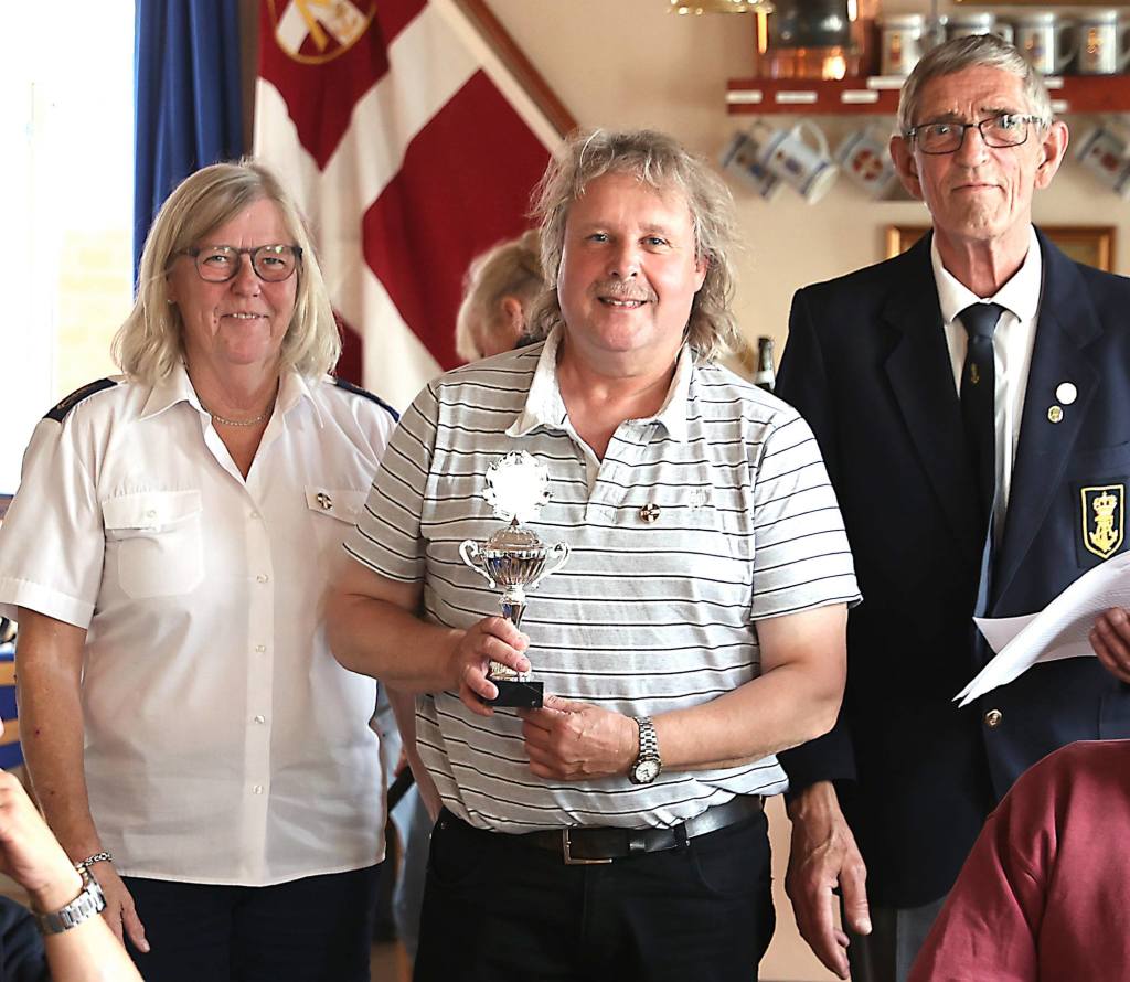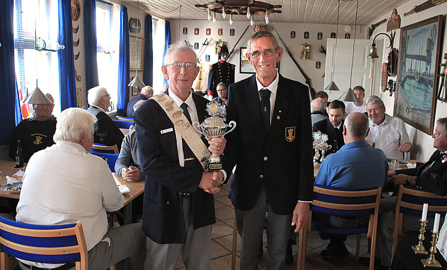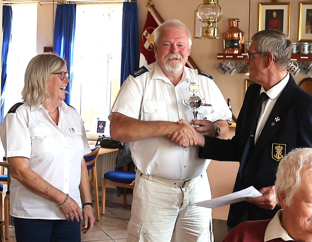 På billedet overrækker Nyk.F. Marineforenings formand Karsten Laugesen pokalen til Nakskovs Henning Larson